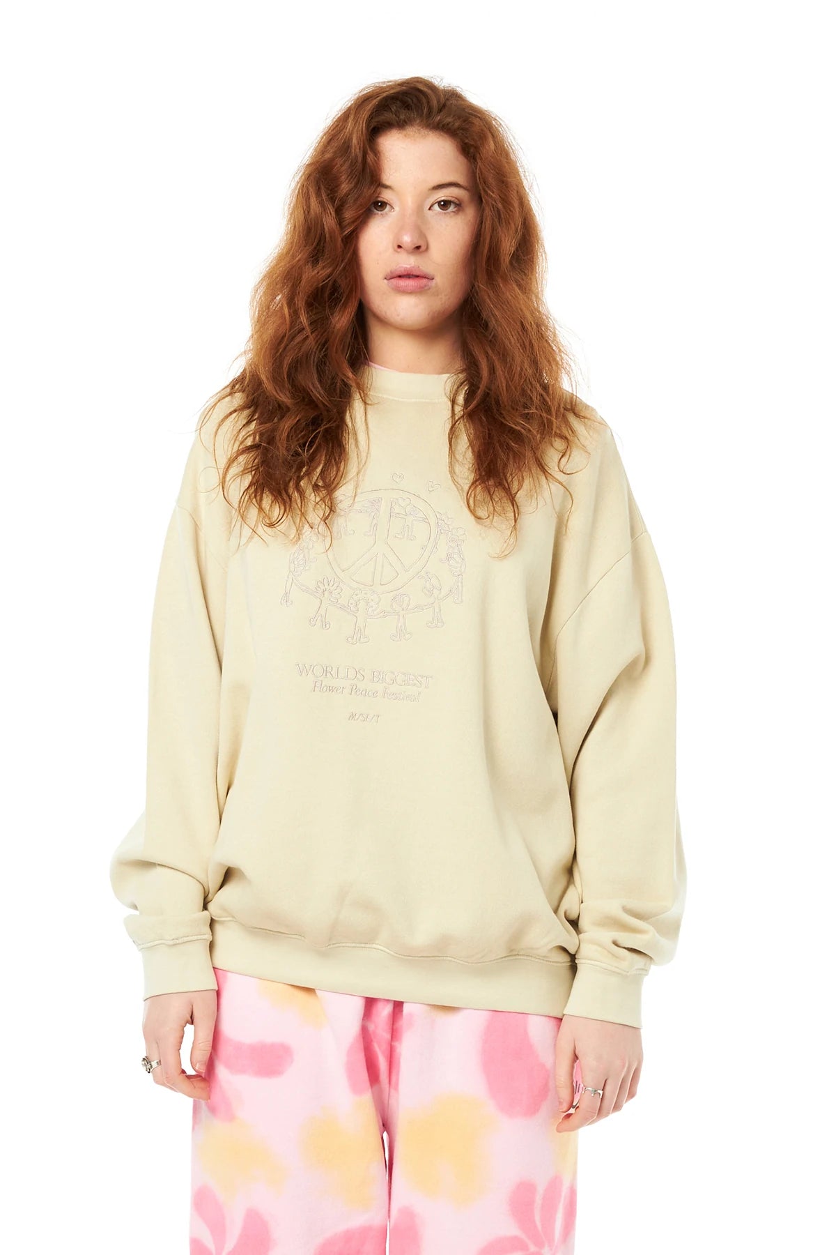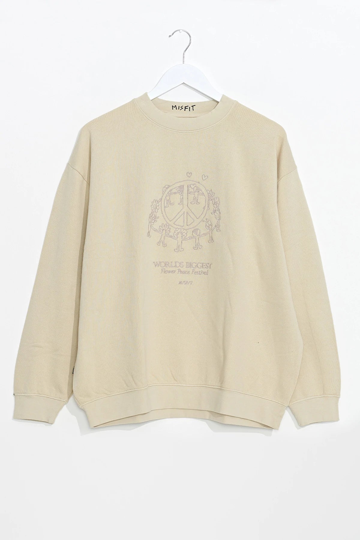 The 'Big Peace OS Crew' in Sand is a 100% Cotton brushed fleece crew. This is a relaxed fit style featuring a CF chest embroidery, "Misfit" branded side seam label & 1x1 rib neckband, sleeve cuffs & hemband.